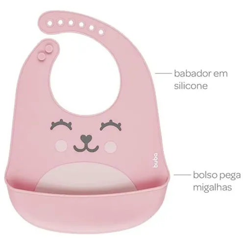 Silicone macio com bolso coletor para facilitar a hora da refeição.