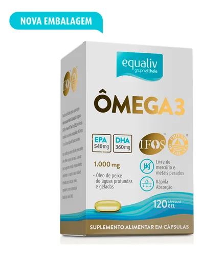 Suplemento de óleo de peixe rico em EPA e DHA em cápsulas gelatinosas.